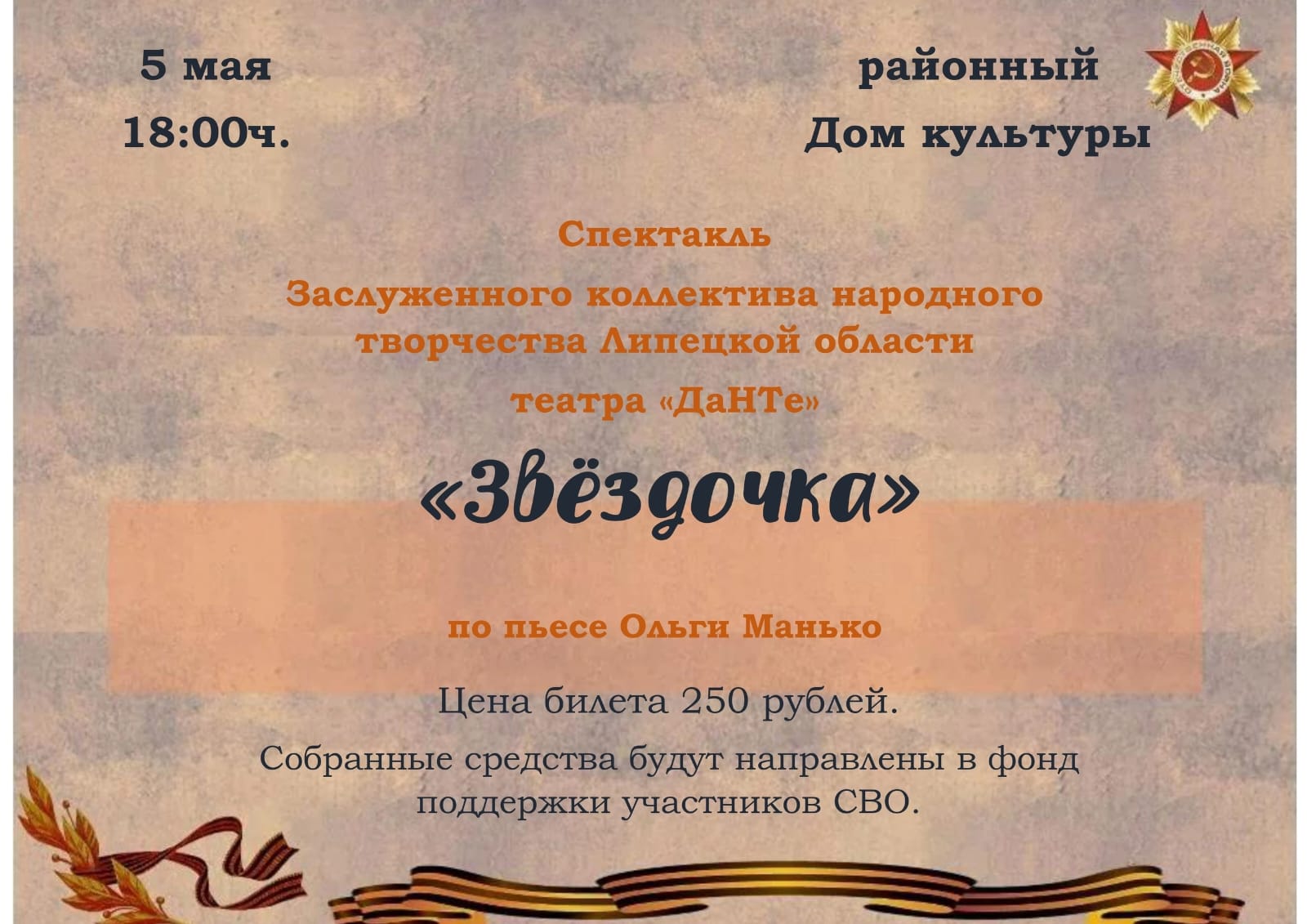 Коллективы Данковского городского суда и Данковских судебных участков Липецкой области посмотрели спектакль «Звёздочка» театра «ДаНТе» (Заслуженный коллектив народного творчества Липецкой области), поставленный по пьесе Ольги Манько. В главной роли выступила Наталья Николаевна Ермолаева, секретарь судебного заседания Данковского судебного участка √2 Данковского судебного района. Вырученные от продажи билетов средства были переданы на благотворительные цели – «на нужды СВО».